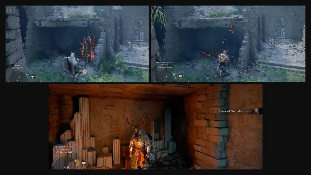 The Frost Cursed Helm can be found in the Chattering Rocks, a snowy ruin area with scattered structures.