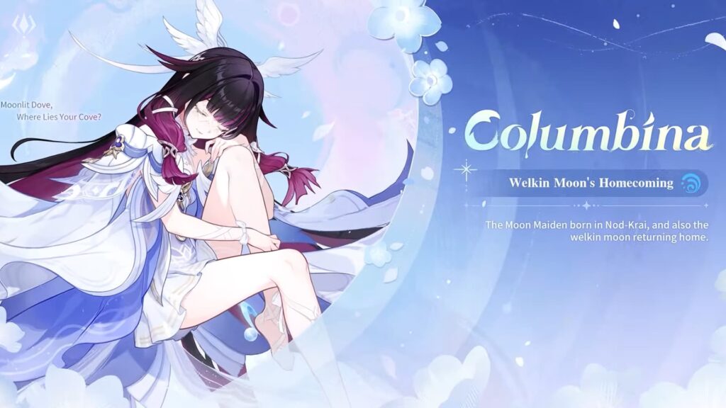 Columbina is easily the most anticipated reveal among the trio. Carrying the title “Welkin Moon’s Homecoming,” her introduction leans heavily into lunar symbolism and emotional storytelling. Soft blues, whites, and feather-like details give Columbina an ethereal presence that contrasts sharply with many of Genshin Impact’s more grounded characters.