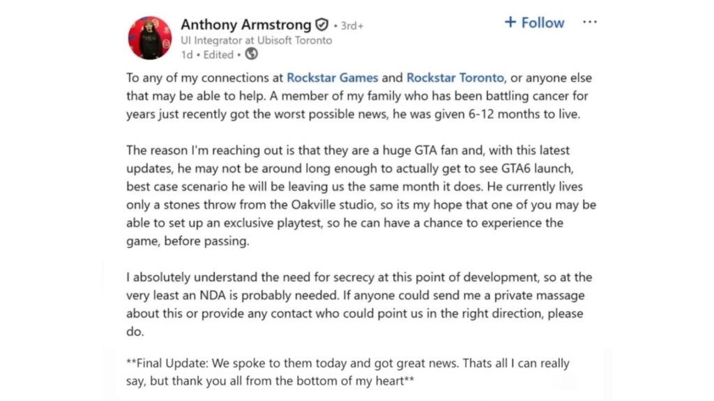 In his post, Armstrong revealed that the family member lives just minutes away from Rockstar’s Oakville studio, prompting him to ask whether an exclusive, private playtest could be arranged so his loved one could experience the game before passing. Acknowledging the sensitivity of the project, he emphasized that he fully understood the need for secrecy and was willing to sign any necessary non-disclosure agreements.
