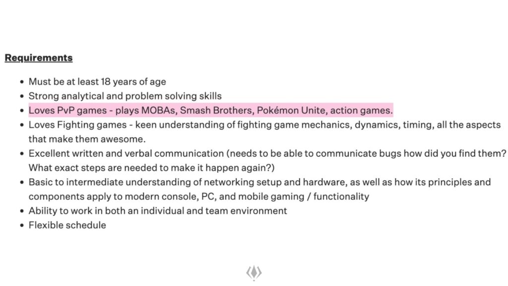 The listing appears to target candidates who “love PvP games,” with specific callouts to MOBAs, Smash Bros., Pokémon Unite, and action titles, alongside a heavy emphasis on fighting game expertise. On paper, nothing unusual. In practice, it reads almost identical to the criteria that contributed to PlayStation’s earlier talent misalignment where testers reported being assigned to projects they had zero experience with, or being selected for roles based on vague genre familiarity rather than actual technical competency.