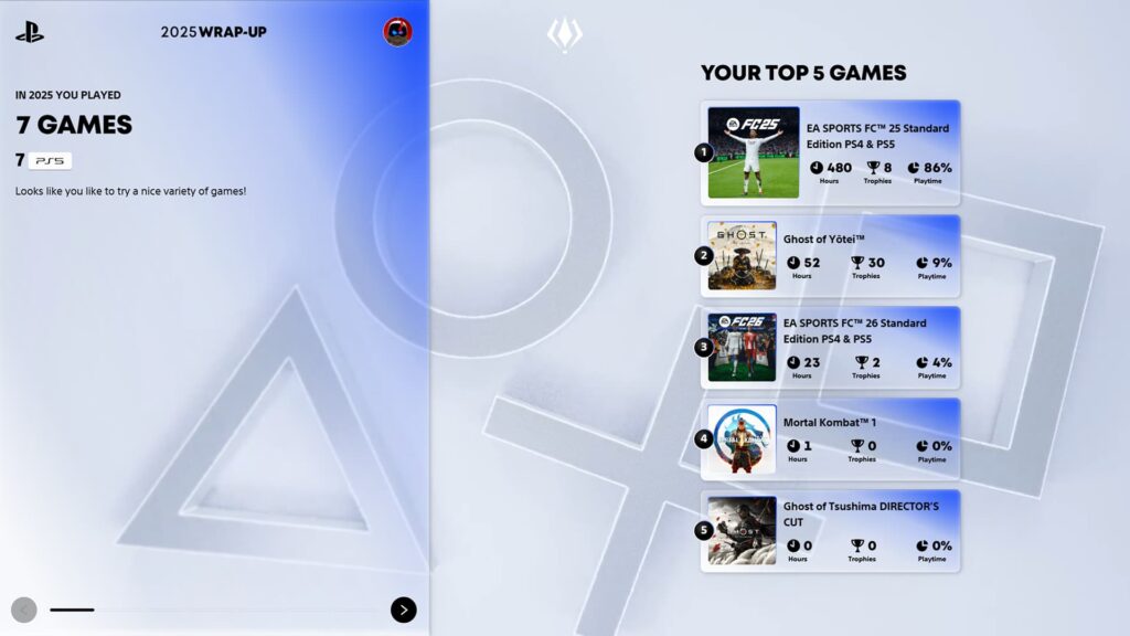One of the highlights is the Top 5 Games list, where each title is ranked by total hours played, trophy progress, and its share of your yearly playtime. Whether your year was dominated by a single blockbuster or spread across multiple genres, these stats make it easy to see which experiences shaped your 2025.